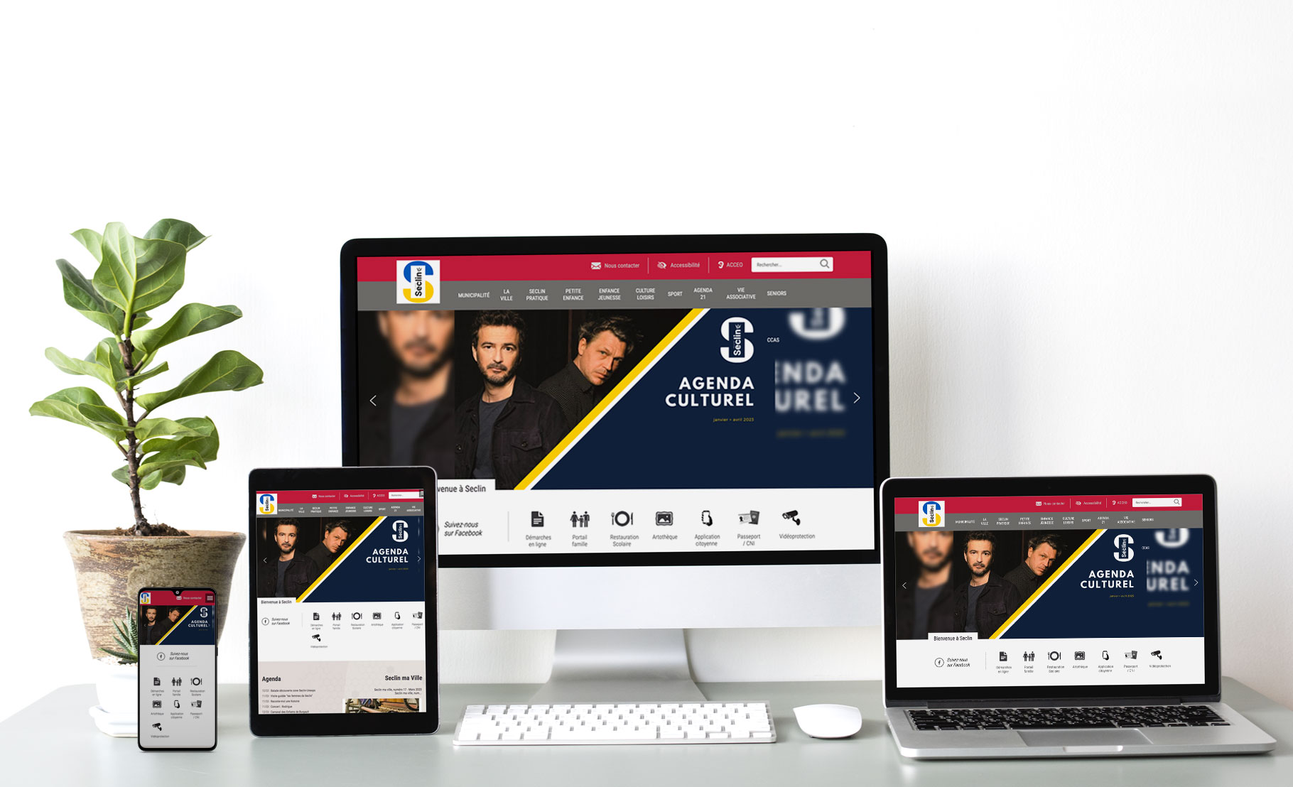 Ordinateur, tablette et smartphone affichant le site web de la ville de Seclin, posés sur un bureau avec un clavier, une souris, deux carnets et une petite plante en pot.